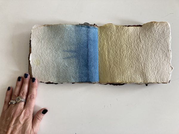 Students will make 18×24 inch sheets of hemp paper -adding natural dye to the pulp. Items collected can be embedded into the pulp sheets or embossed onto the surface of the wet paper. The students will form handmade sheets into the next project, theme environmental transformation