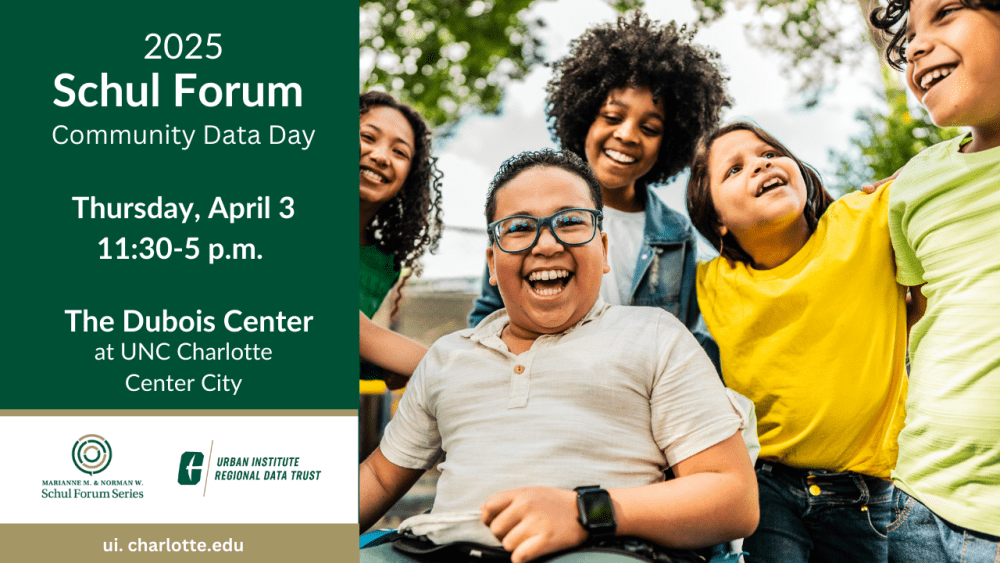 Register for the Charlotte Urban Institute’s Schul Forum from 11:30 a.m. to 5 p.m., Thursday, April 3, at The Dubois Center at UNC Charlotte Center City. This event will explore how using data and research can make a difference in our lives and our communities.