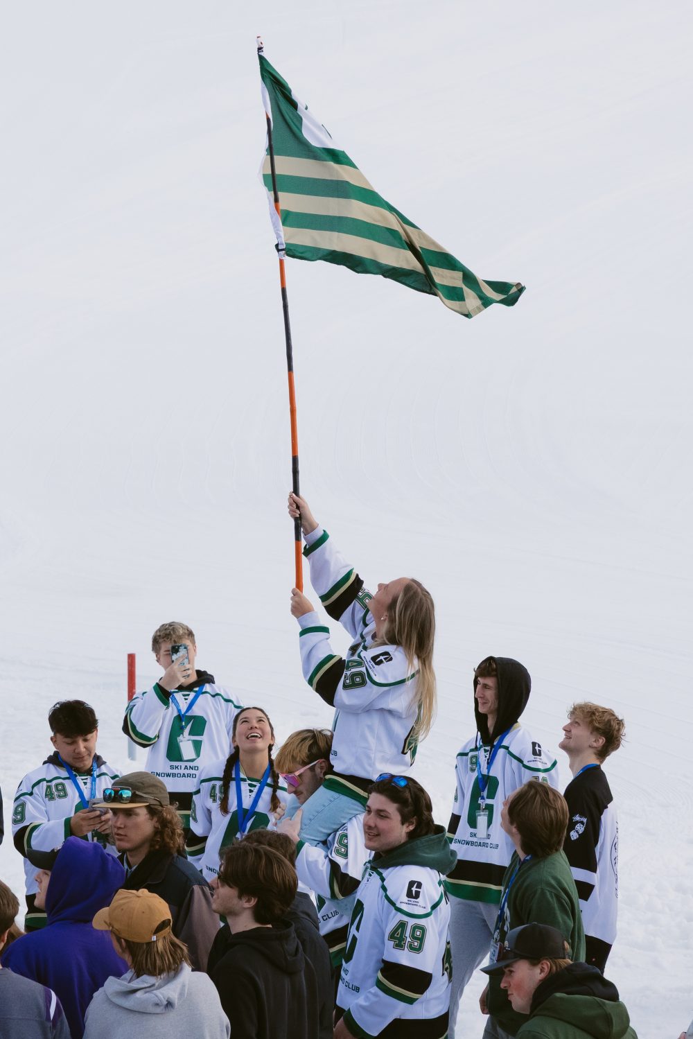 The proverbial outsiders from Charlotte hoisted up Madeline Lay, a senior member and vice president, who in turn raised a green and gold flag above a sea of college skiers and snowboarders from California, Utah, New England and beyond.
