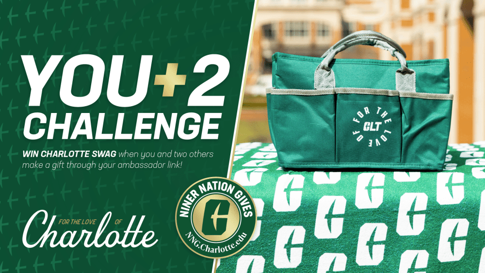 Become an ambassador and take part in the “You + 2” challenge by making your gift and encouraging at least two others to give through your unique link. Complete the challenge and you’ll earn exclusive Niner gear for your support.