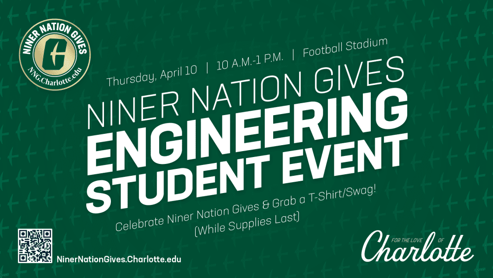 Stop by the football statue in front of Richardson Stadium from 10 a.m. to 1 p.m., Thursday, April 10, for the Niner Nation Gives Engineering Student Event. Don’t miss out on a dunk-a-dean (or department chair), pizza, swag (while supplies last) and fun!