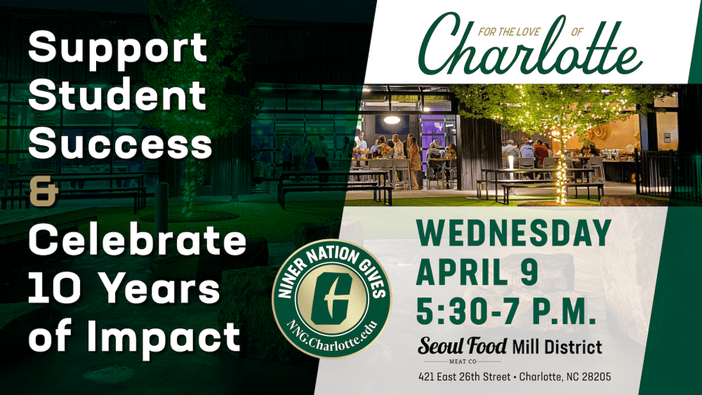 Join alumni, students and friends in celebrating a decade of Niner Nation Gives — an opportunity to make a direct impact. Enjoy great food, live music and hear firsthand how student groups are making a difference in Charlotte and beyond at Seoul Food Meat Company Mill District, 5:30 to 7 p.m., Wednesday, April 9.