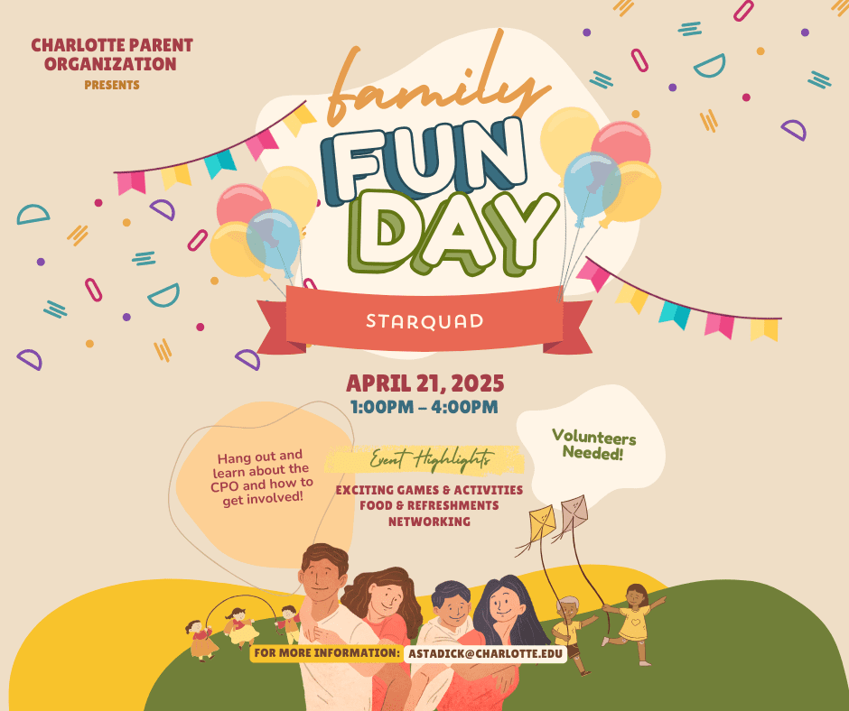 The Charlotte Parent Organization will host a Family Fun Day from 1 to 4 p.m., Monday, April 21, at the Star Quad to promote community and support Charlotte students and employees who are parents.