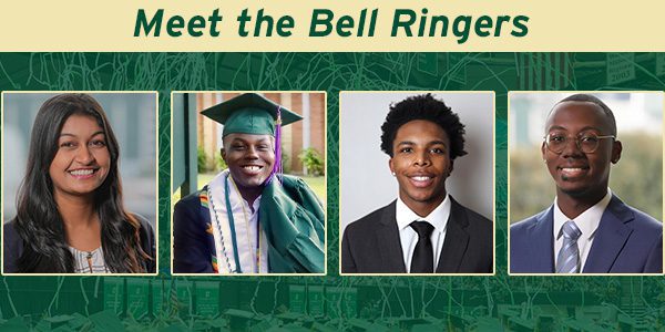 Sonia Birla, Tye’Quez Wilkins, Uriah West and Justyn Ramseur are the bell ringers for Spring Commencement, a long-standing tradition where distinguished students ring the UNC Charlotte bell. Read more about these remarkable Niners.