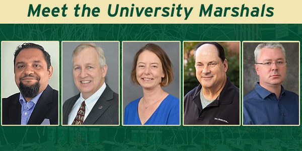 University marshals are faculty members selected to represent their colleagues at ceremonial functions of the University. Get to know the marshals for Spring Commencement: Juan Vivero-Escoto, Steve Schmid, Kelly Powers, John Taylor and Kirill Afonin.