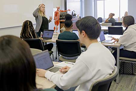 For example, students who take Applied Kinesiology for Human Performance will explore human anatomy and biomechanics, which will aid in analyzing how an athlete moves, jumps and lands. This involves knowing the muscles involved and how one can best explode off the ground to jump as high as possible. Examining data collected on strength, jump height and other biomechanical variables would provide robust information. Using data collected all season, a sports analyst could identify a trend toward suboptimal movements, leading to a holistic approach to correct the situation — modifying training, targeting different muscle groups or employing movement correction strategies.