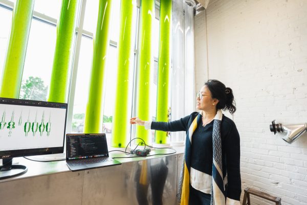 Kyoung Hee Kim, professor of architecture, has been prototyping microalgae-filled building façade systems since 2011. These unique designs provide shade from the sun, filter out carbon dioxide and impurities, and release fresh, oxygen-rich air.