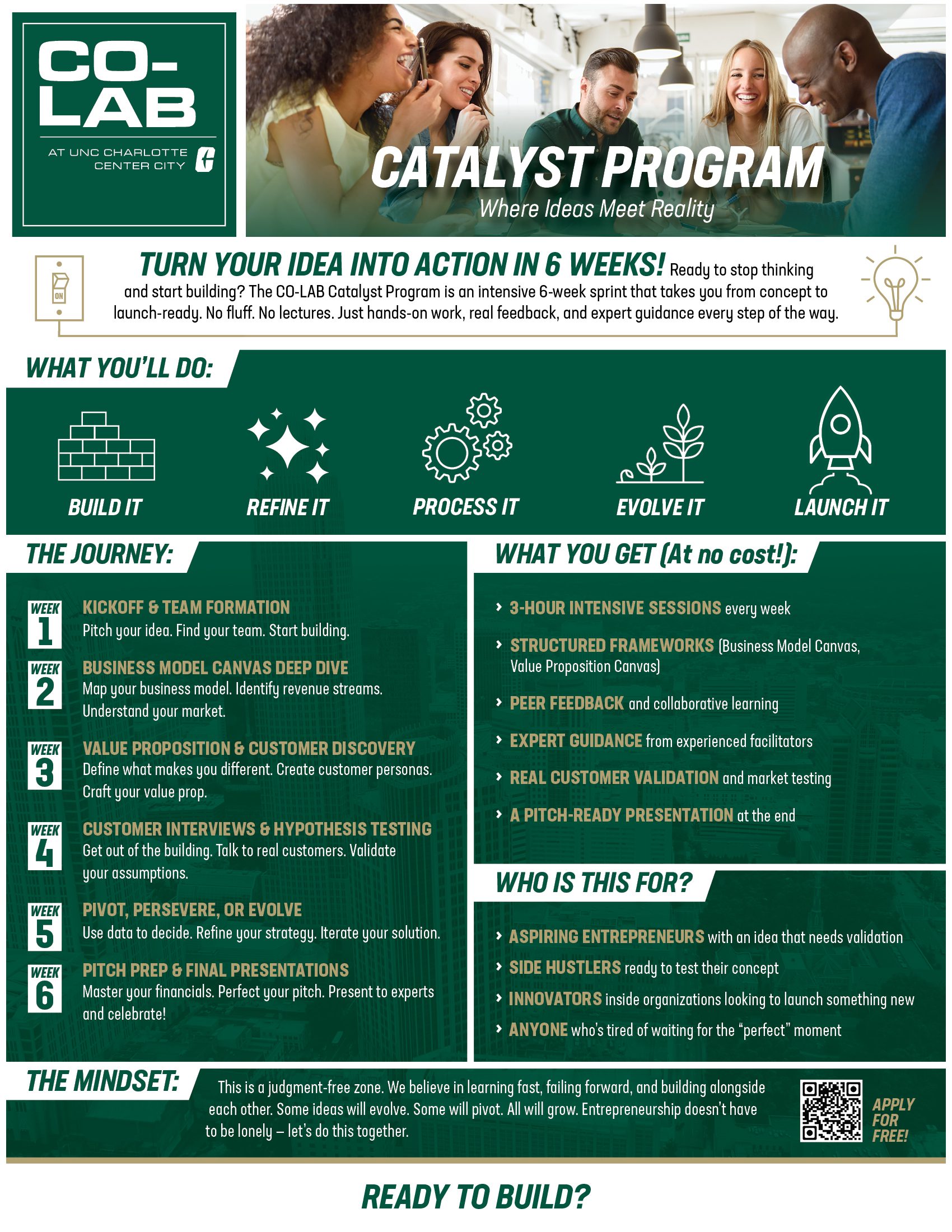 CO-LAB has launched its new Catalyst Program, a six-week intensive program designed to help aspiring entrepreneurs transform early-stage ideas into launch-ready ventures. The program, limited to a single cohort of 20 participants, blends hands-on building with expert guidance and real-world customer validation.