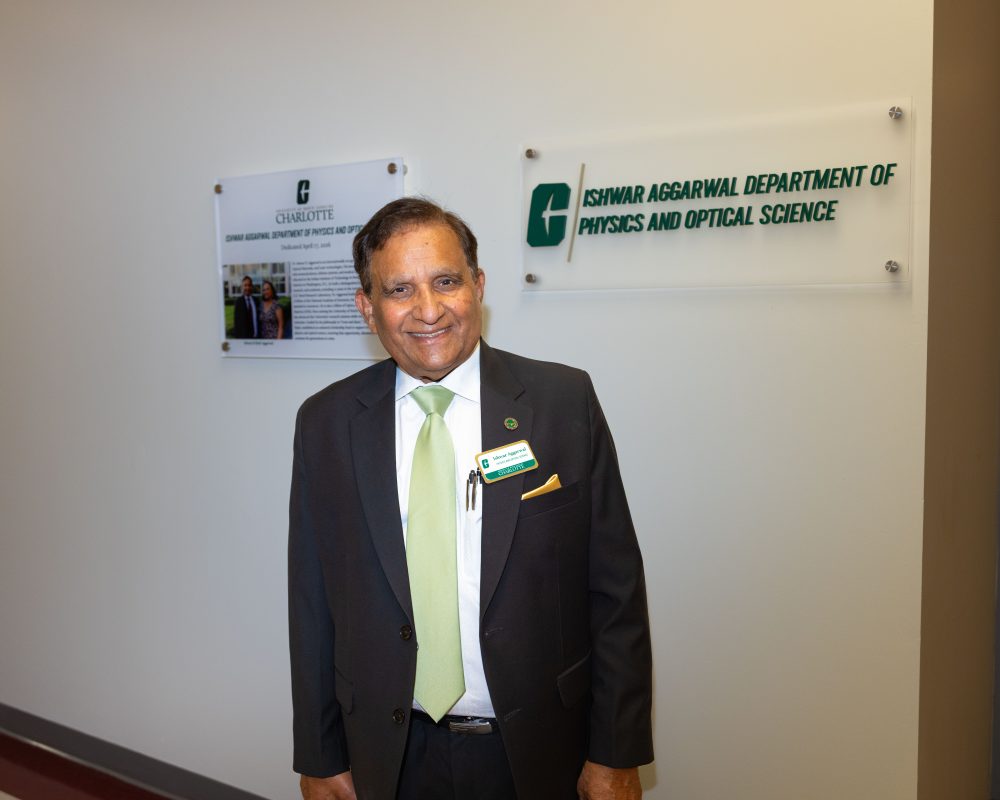 The Aggarwal endowment will support merit-based scholarships for students pursuing graduate degrees in physics and optical science at UNC Charlotte, with priority given to Ph.D. students.
