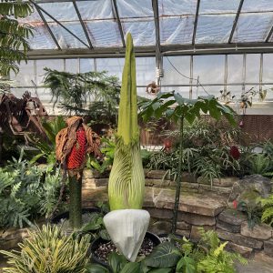 As of Thursday, April 23, Smellvis, the newest titan arum in the UNC Charlotte Botanical Gardens to enter a bloom cycle, has crossed the five foot mark and is 61″ tall. The growth is slowing down to about an inch a day and some of the classic red color is developing on the spathe, indicating […]