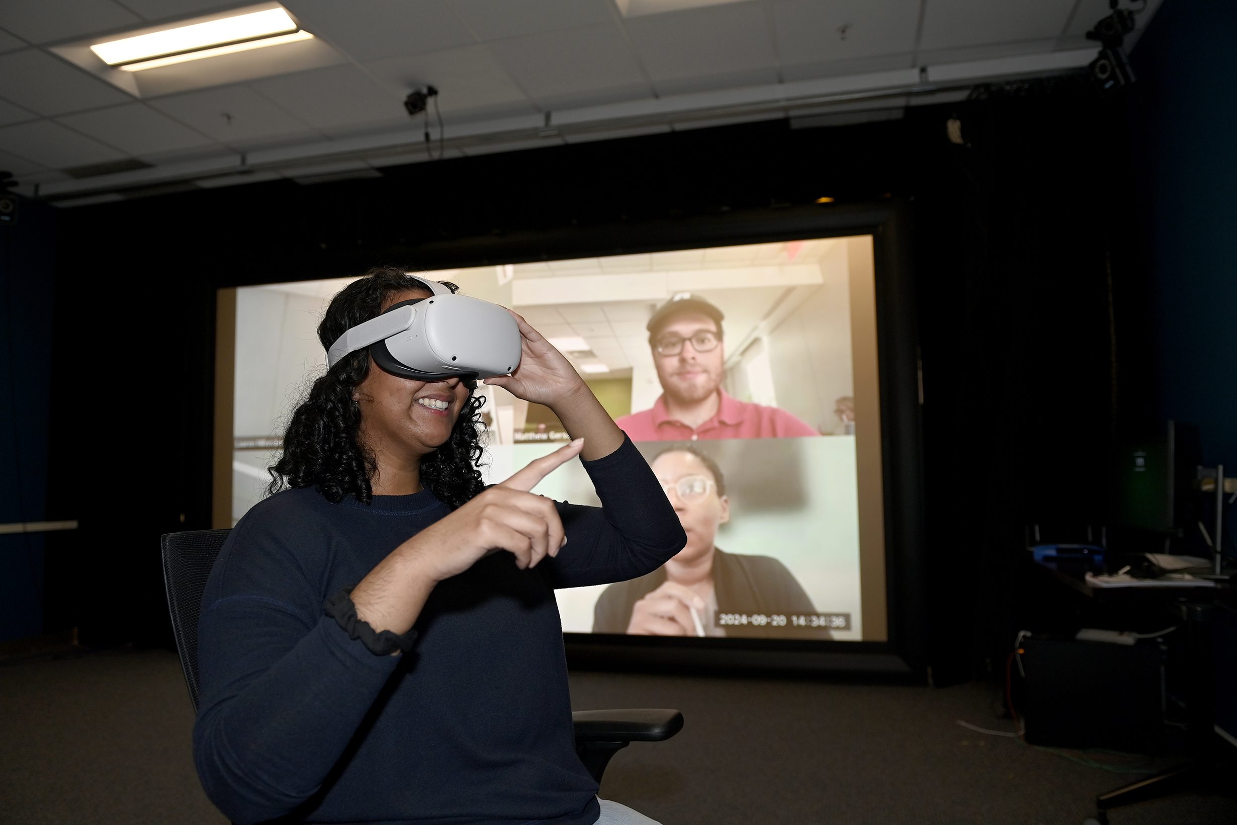 Divya Doshi uses virtual reality goggles to observe and describe to fellow Ph.D. students characteristics of leadership seen in virtual interactions. Doshi and project lead George Banks also engage Business Honors Program undergraduates in similar studies using the goggles.