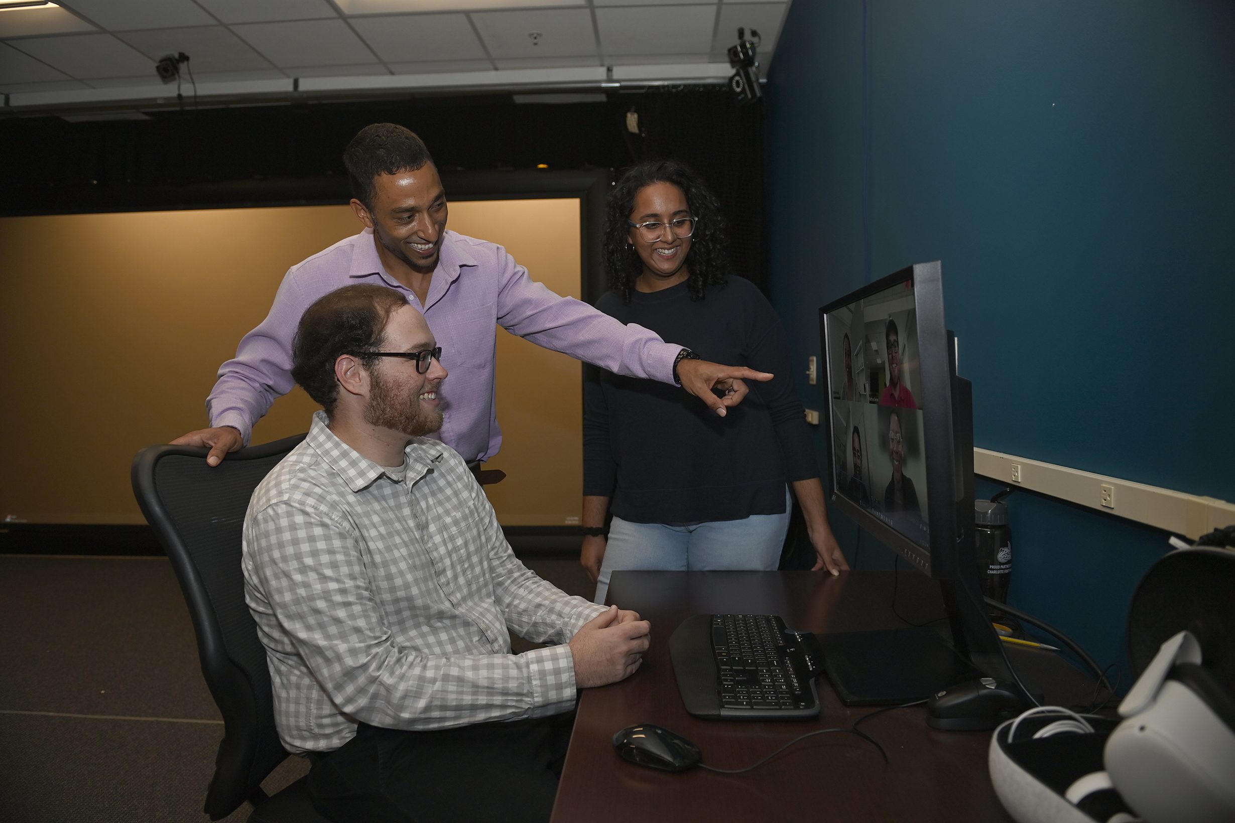 Team lead George Banks, center, strategizes with Ph.D. students Matt Gerson, left, and Divya Doshi on behaviors they have pinpointed through analysis of text and other cues from virtual settings.
