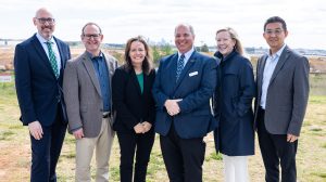 Tara Cavalline and Jack Christine (center) with (l to r) Vice Chancellor John Daniels, Dean Rob Keynton, Chancellor Sharon Gaber and Executive Director Lingguang Song.