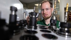 A student wearing safety glasses adjusts a tool holder on a machine, with multiple drill bits and tool slots visible in the foreground of a manufacturing lab.
